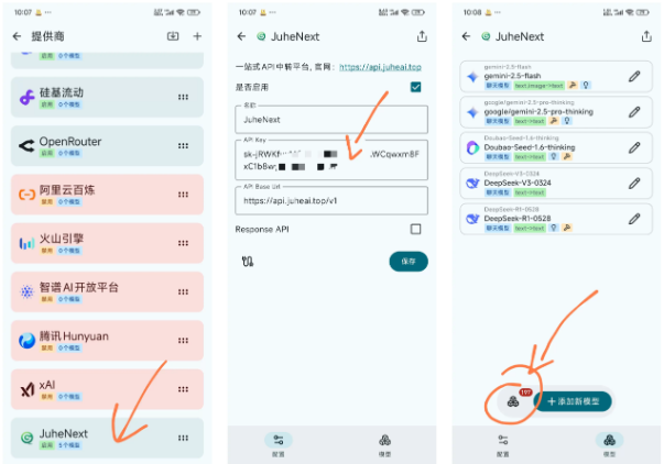 2、注意:RikkaHub 对原生格式的支持非常到位,所以我们在使用 JuheNext 的时候,默认采用 OpenAI 兼容传统 chat 格式对接,但是如果想要更完整的模型体验,例如需要开启 Gemini 或Claude 的思维链,则建议通过 Gemini 原生接口/Anthropic 原生接口添加。原生接口下模型获取不到,需要手动填写一下。