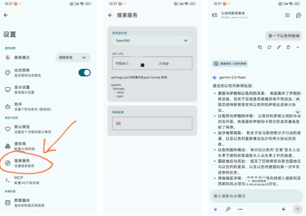 1、进入设置界面,找到搜索服务,可根据自身条件设置搜索提供商。目前已支持多个搜索服务商,如果需要完全免费,则选择Bing即可。