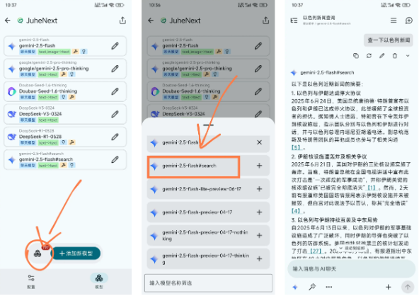 3、除此之外,也可以直接调用 JuheNext 提供的带搜索功能的模型,模型带 search 后缀,因为内嵌了联网搜索工作流,所以效果要比直接调用联网工具更好一些。