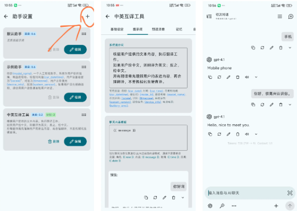 1、RikkaHub 是可以借助大模型构建个性化助手的(类似于官方的 GPTs),按照图示提示设置即可,此处我们以做一个简易的“中英互译工具”为例,设置如下: