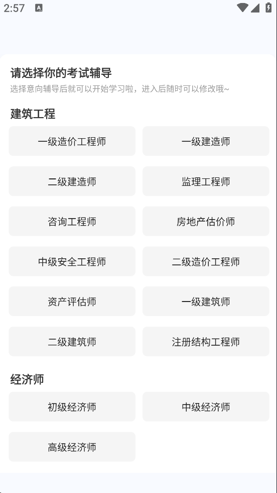在App首页点击“题库”或“百套题库”入口,选择考试类别(如一级建造师、造价工程师等)。