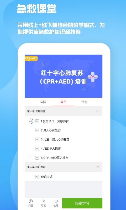2、提供涵盖心肺复苏(CPR)、海姆立克急救法、溺水、中暑、创伤止血、烧烫伤处理等20余项常见急症的专题课程,支持分步学习与章节测试。