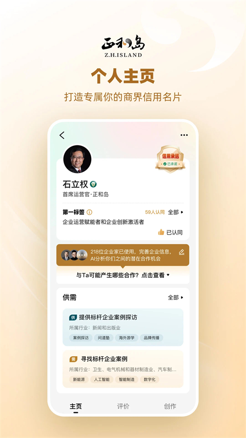 2、用户可创建专属主页,展示企业信息、个人成就与商业标签,吸引志同道合者主动连接。