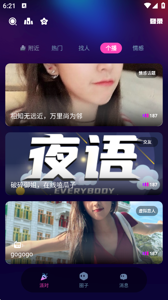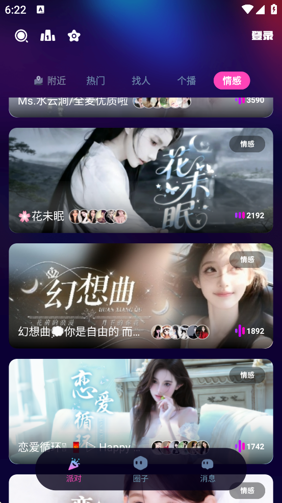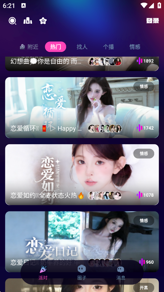 5、主题语音房间:开放“情感树洞”“音乐分享”“游戏开黑”等多人语音房,用户可自由加入或创建房间,参与实时群聊互动。