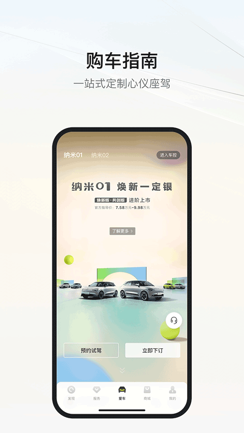 选车购车:在“选车”板块查看最新车型配置、高清实拍图及优惠政策,支持在线预约试驾或直接下单定制个性化配置。