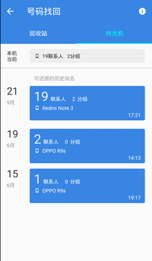如果您的手机通讯录错乱或名片被误删,可通过点击右下角【我的】菜单中,点击【号码找回】,即可找到“时光机”对手机通讯录进行恢复,亦可在“回收站”中找到最近被删除的联系人,添加回手机通讯录中。
