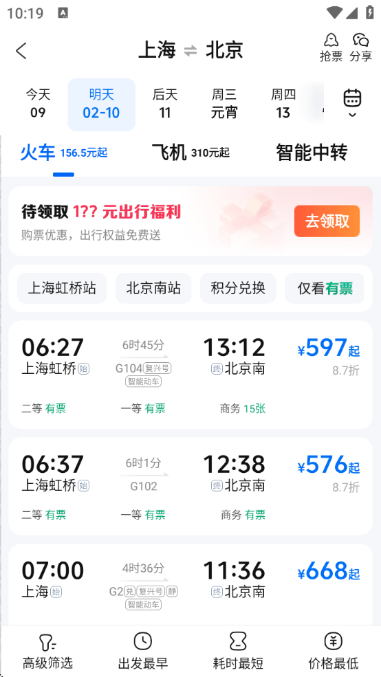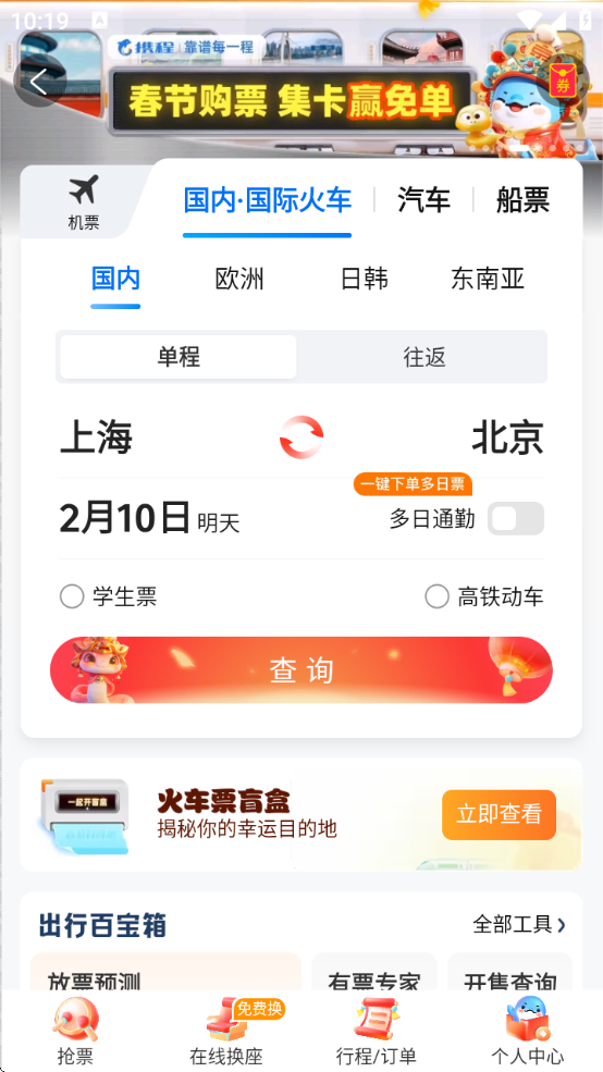 3、火车票:国内外火车票随心订,还支持学生票,儿童票,12306直连购票。