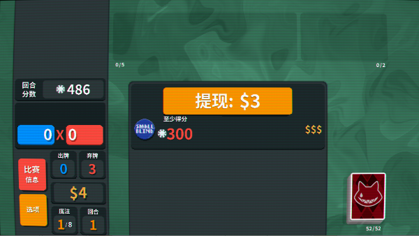1、玩家的游戏目标就是不断赚取筹码来击败对手的盲注。盲注分为小盲注、大盲注以及Boss盲注三种。其中Boss盲注会对玩家的操作有所限制(比如方片牌不计分等),通关后“底注”会增加,难度也会随之提高。