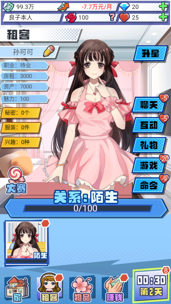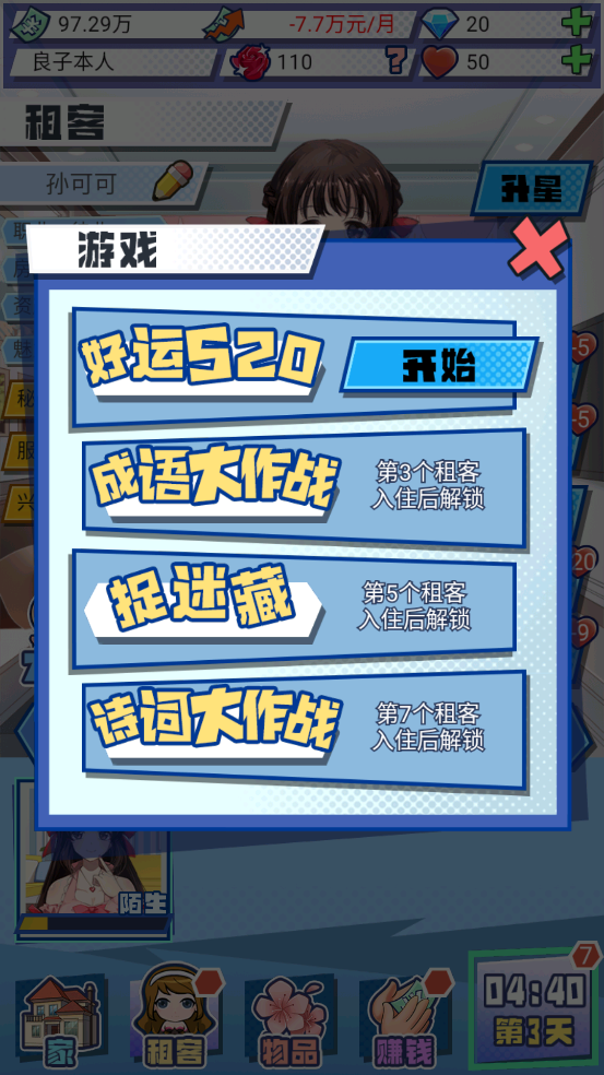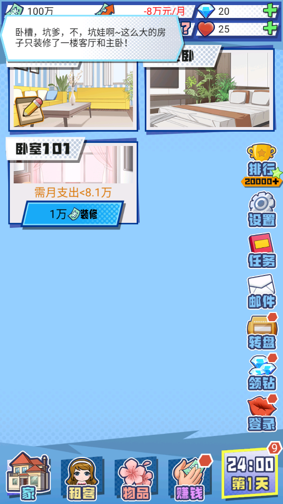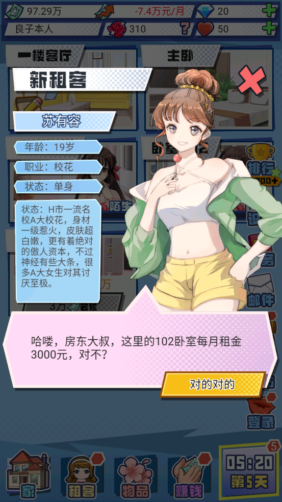 3、达到某种特定的解锁条件,可装修各种风格的房间,邀请越来越多的美女租客入住。