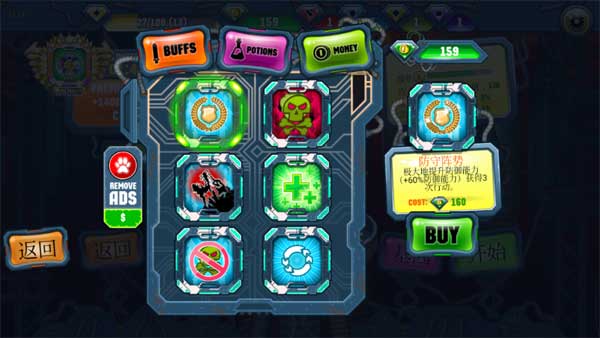 4、每个关卡的对战都有着不同奖励,可以在商城当中购买皮肤,增加防御能力。