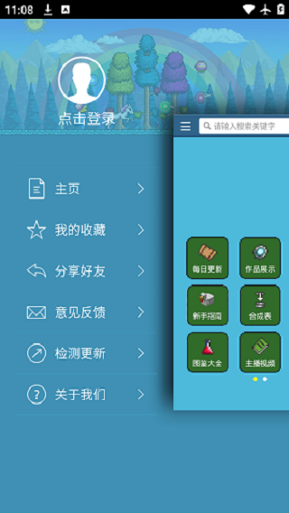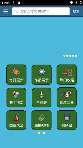 1、打开泰拉瑞亚盒子官方正版,可以看到每日更新、作品战士、新手指南、热门攻略、合成表、图鉴大全、套装武器等功能。