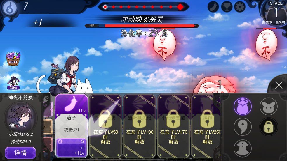 4、技能怎么升级我技能茄子当然是主加的,其他技能每点一级就会涨很多钱,所以看每关的收入,当能够轻易达到其他技能升级条件时再加,因为提前赚钱加了也强不到哪去,还是很多还是根据茄子伤害来算的。