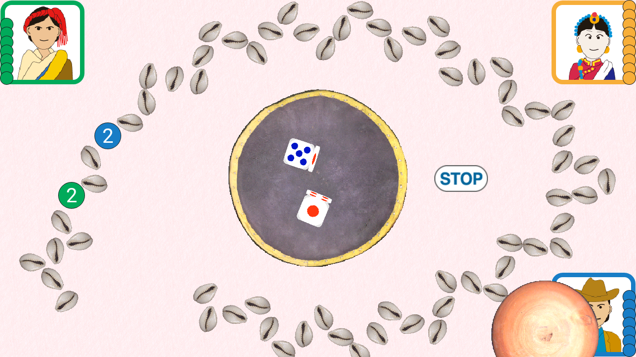 3、把2个骰子用木碗摇动后扣下,根据骰子的眼数移动硬币。