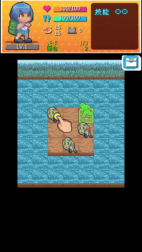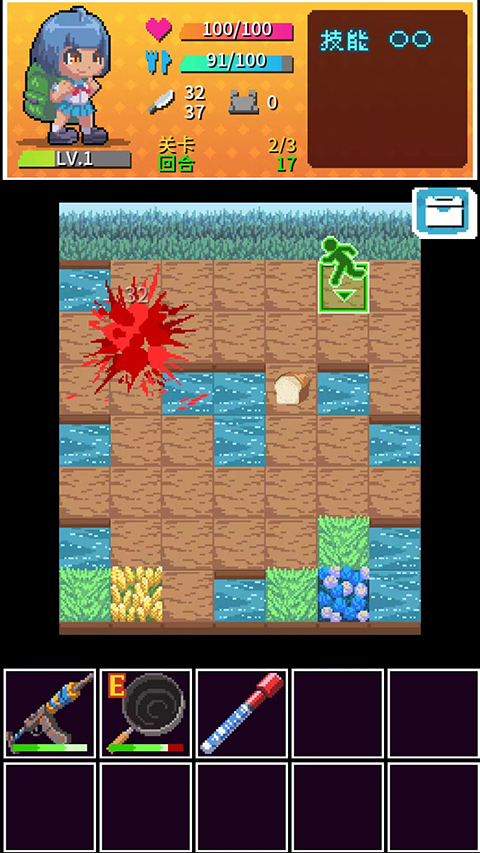 3、当方块中出现僵尸时点击攻击,对战过程中可使用止痛药回复生命,注意状态维持;