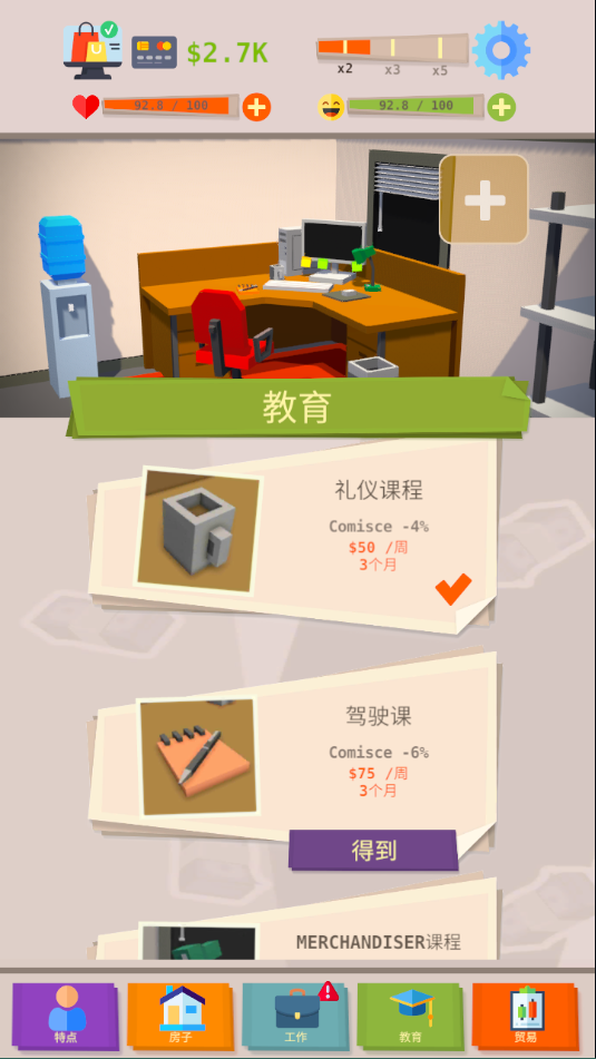 3、完成课程后可以解锁更好的工作,让主角的收入迅速提高。