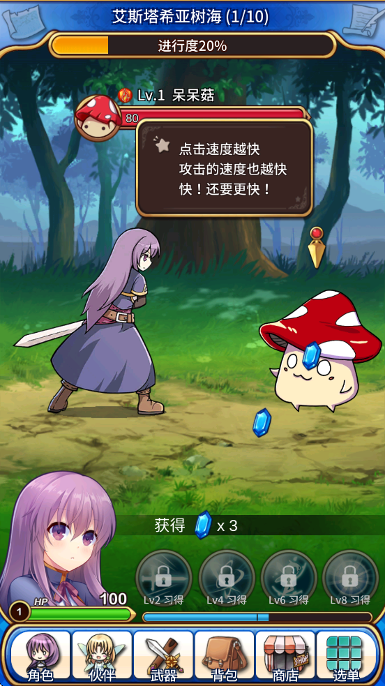 1、操作方式:游戏采用点击式操作,点击屏幕上的怪物即可发起攻击,点击速度越快,攻击速度也会相应提升。