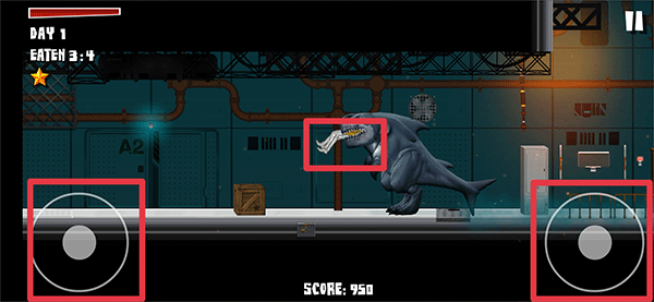 3、使用左侧的按钮控制鲨鱼的跳跃和蹲下,实时调节鲨鱼移动;同时,利用右侧的按钮吃掉路上的人类,精进你的技能。