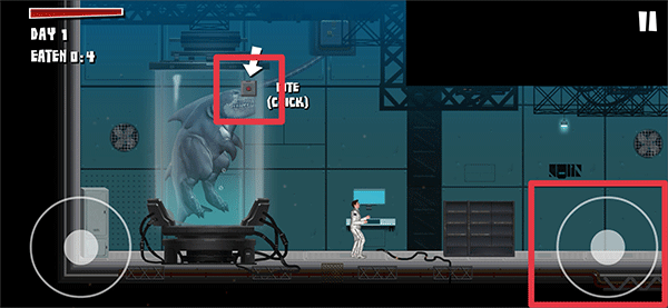 2、进入游戏后,快速点击右下角的按钮操控鲨鱼咬碎开关,成功逃离水箱,立刻开始你的冒险。