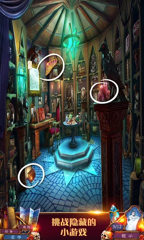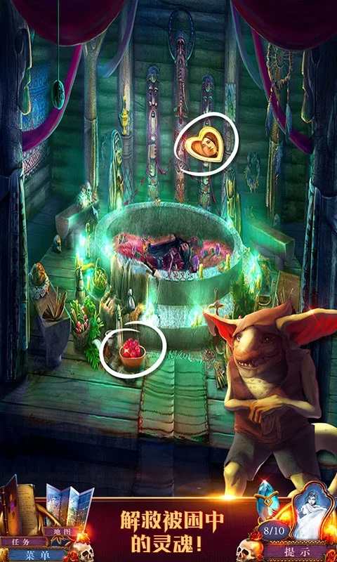 场景互动:点击环境中的物品(如首饰盒、镜子、草药等)收集线索,部分道具需组合使用(如吸盘+木棒、钩子+项链)。