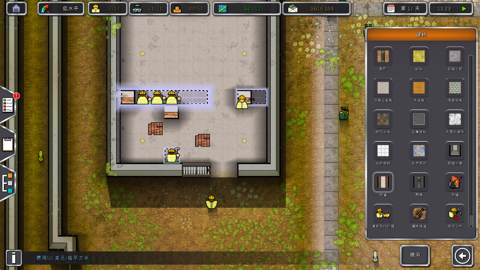 3、自由度高:玩家可自由设计监狱布局,如选择3×3或4×4牢房,并通过建筑布局影响囚犯情绪和行为。