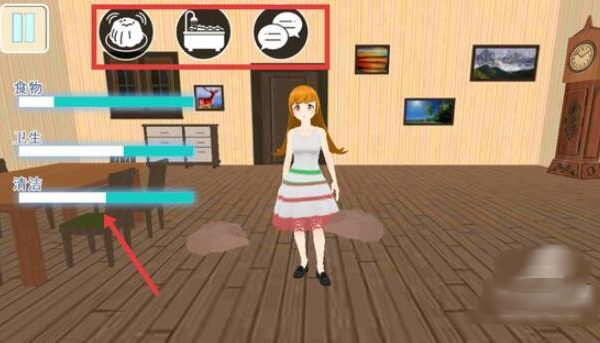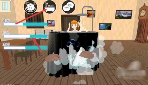 3、点击洗澡图标,使角色进行洗澡操作,提升卫生状态,同时留意状态条的变化。