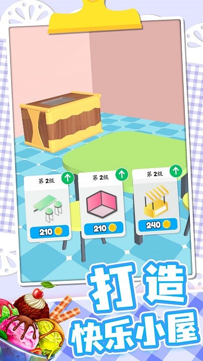 1、这是一款可以自由制作甜品的模拟经营游戏,玩家在游戏中可以选择制作球冰淇淋、甜筒冰淇淋、冰棍等甜品类型。