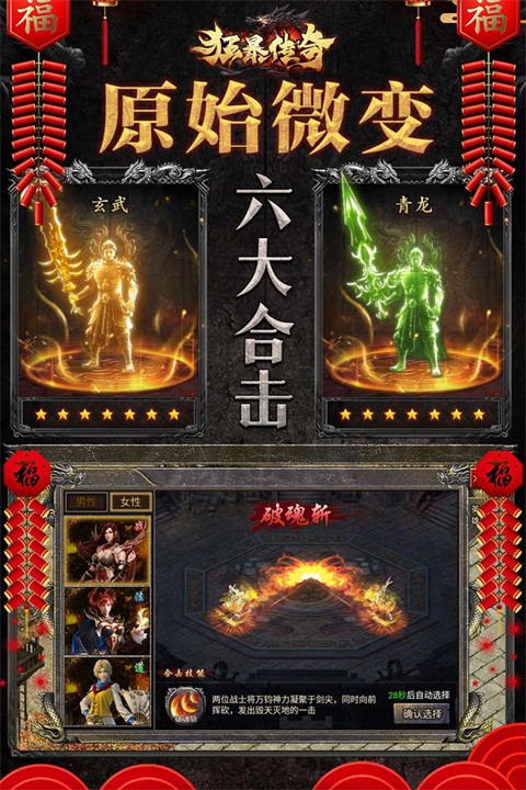 1、合击系统:战士+战士的破魂斩、法师+道士的末日审判等九种职业组合,六大合击技能,策略性极强。