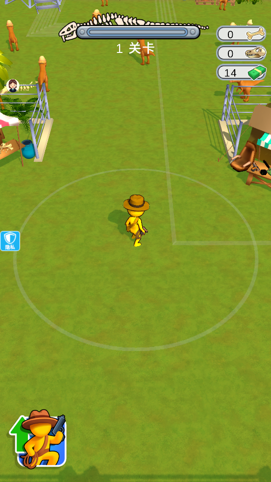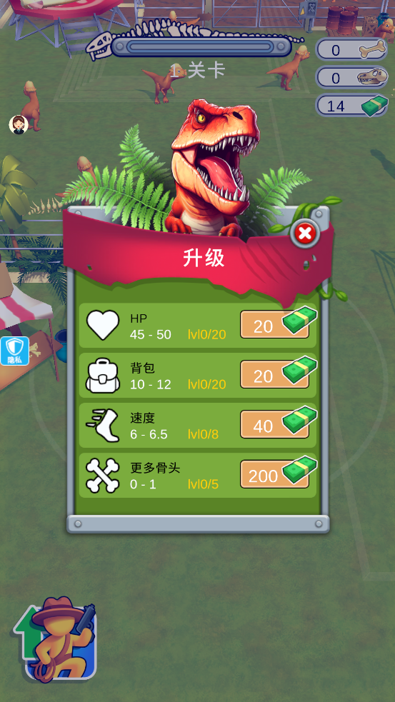 1、进入【1关卡】,操控角色探索恐龙园区,收集资源,留意周边恐龙与场景道具。