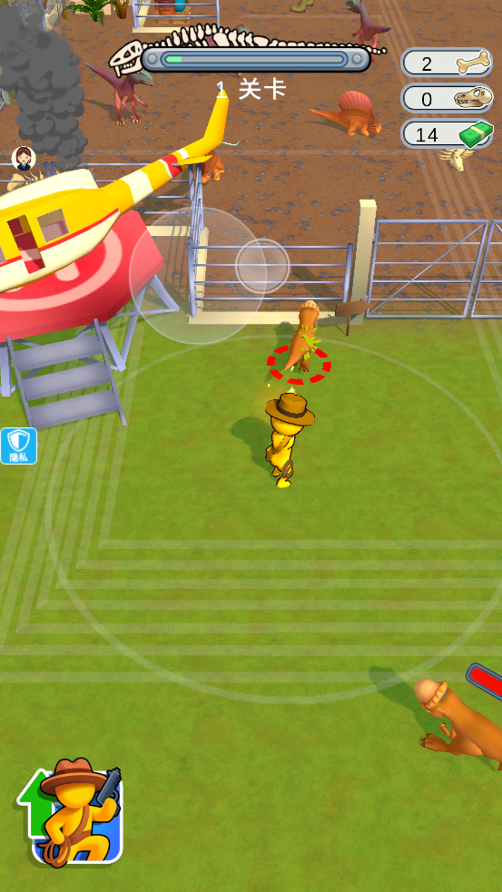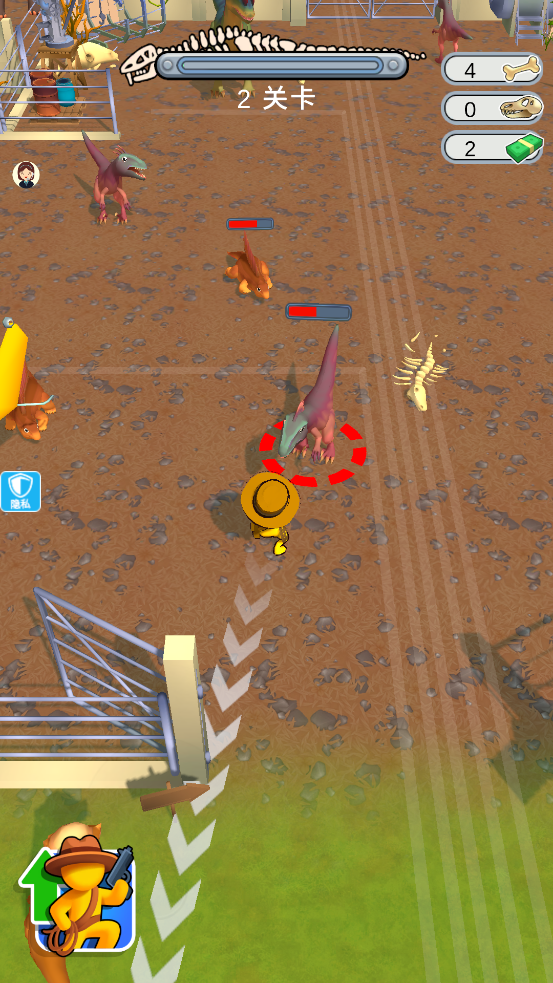 2、遭遇恐龙时瞄准攻击,击败敌人推进关卡,积累战斗经验与奖励。