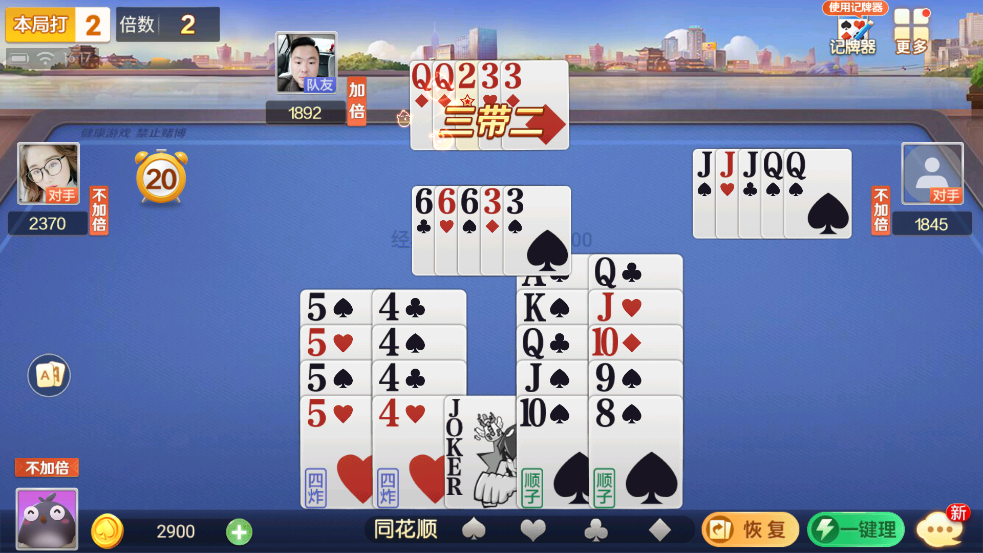三带二:数值相同的三张牌加数值相同的二张牌(如555QQ、JJ33)。