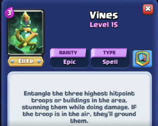 藤蔓法术是游戏的第121张牌;这是一张3费圣水的史诗法术,拥有非常强大的机制。史诗牌本来就稀有度最高,而这张牌的加入进一步提升了它的领先优势。
