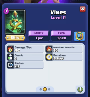 正如卡牌描述所解释,藤蔓的机制与闪电类似,因为它会寻找生命值最高的目标,包括部队、建筑甚至皇冠塔。但与闪电不同的是,藤蔓会立即选择三个目标,这使得它更难被阻挡。