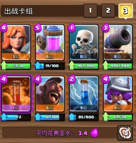 这个卡组的主要是以消耗和一波流为主,利用皇家巨人的远距离攻击和毒药进行消耗,同时我们的法师在后方来保护皇家巨人不被一些人海卡牌骚扰,为其提供好的输出环境。这个卡组前期的时候需要先放采集器来储存和赚取费用,其他卡牌进行防守,如果敌方也出采集器的话,我们可以用毒药进行消耗。在中期的时候,我们在法师对抗了敌方的卡牌时,如果我们的费用较高,那么可以前排搭配一个皇家巨人来进行消耗,法师则用来保护皇家巨人。在后期的时候,我们在其他卡牌解除了敌方的卡时即可打出强力的反击,进行皇家巨人+毒药法术+法师+迷你皮卡的套路,在这一波中,毒药法术能很好的限制敌方的速度,同时进行消耗,皇家巨人为主要输出,迷你皮卡则是对抗敌方出现的高血量卡牌,法师则是对付人海卡,所以这一波是很强的,最后通过不断的消耗来带走对方。