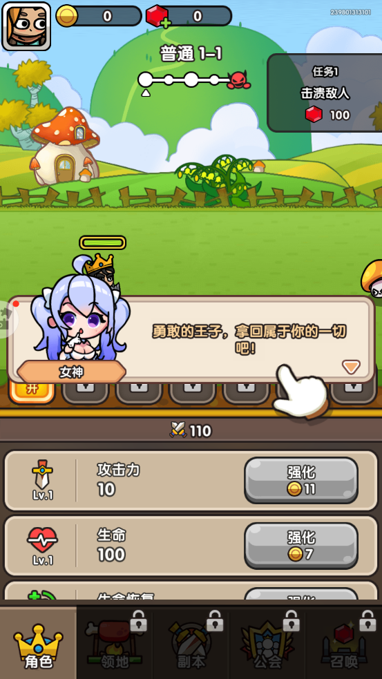 1、升级王子的英勇能力,并自动对抗来势汹汹的怪物。