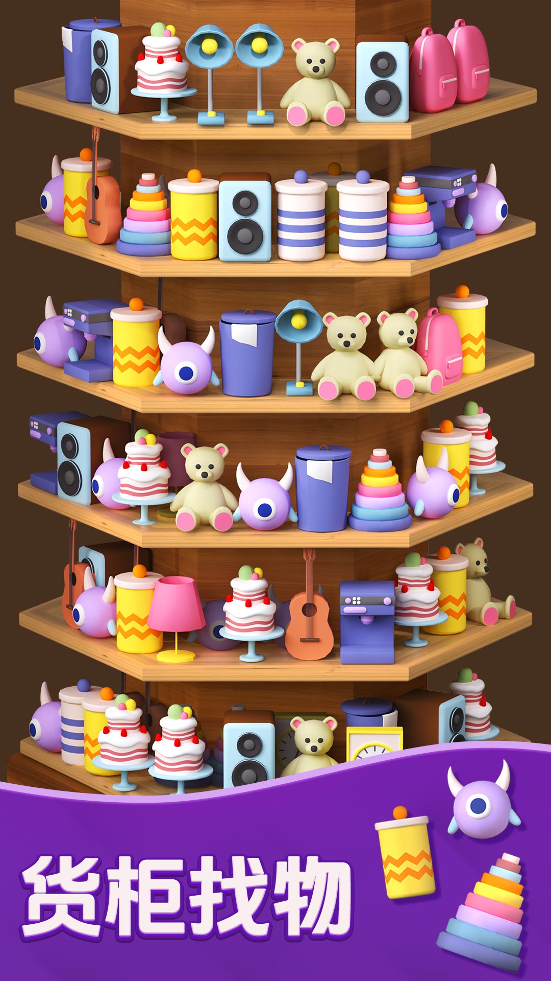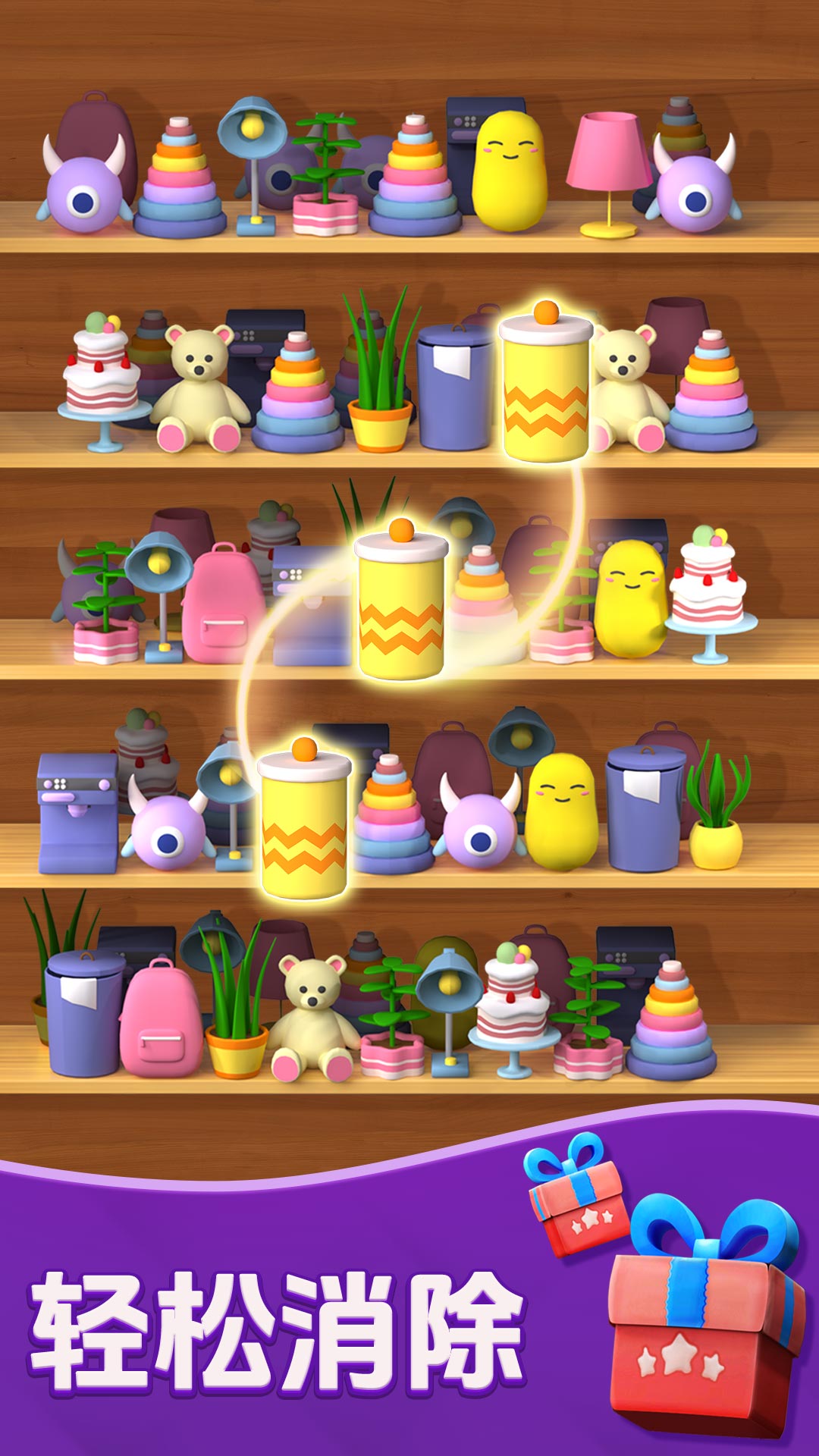 1、将经典消除与货柜管理结合,玩家需通过滑动屏幕将相同图案移至同一货架消除,同时整理货柜布局。