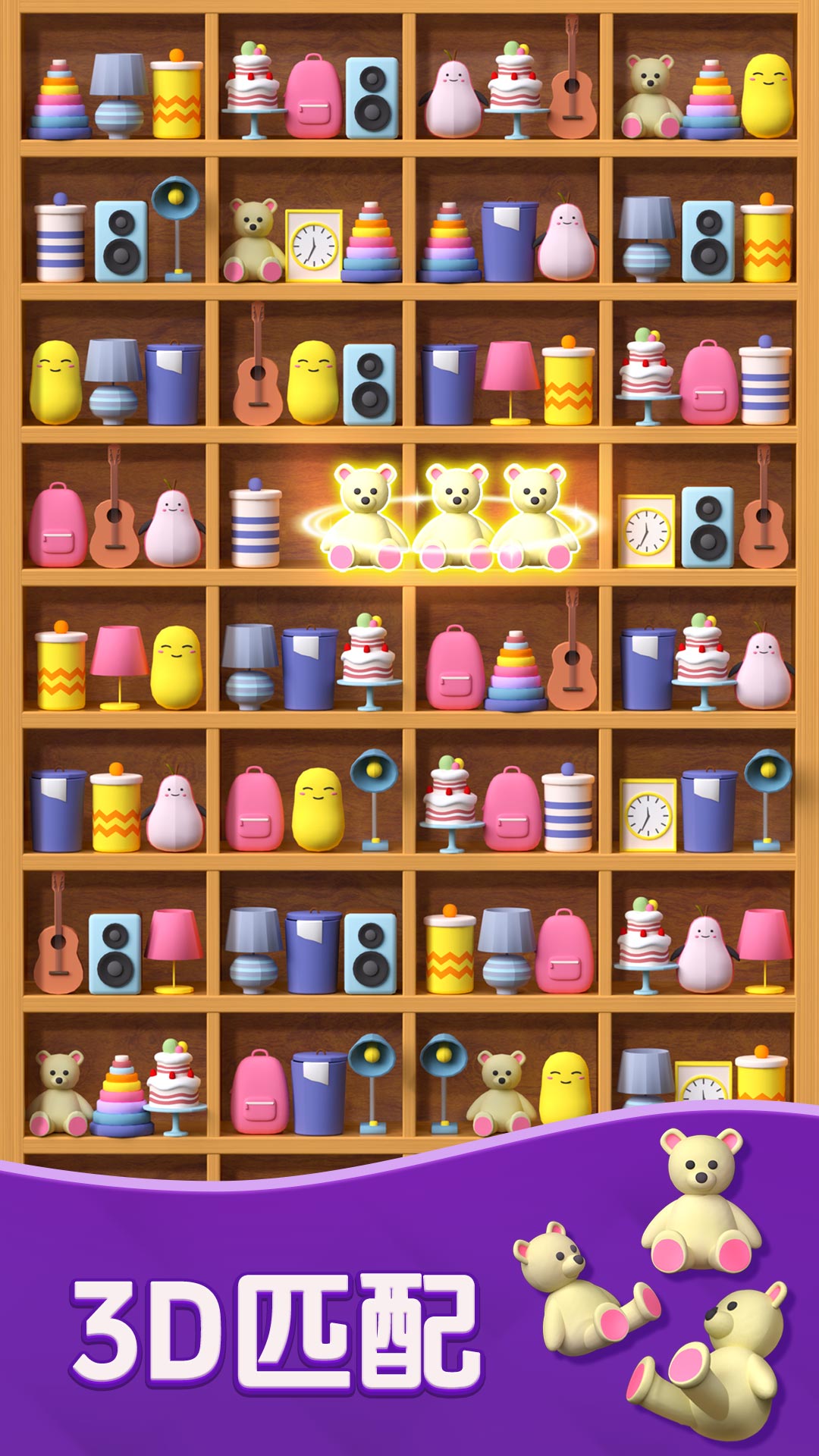 消除规则:把相同物品拖到同一货架,凑够3个就能消除。注意货架有层次,前排物品没清完,后排是动不了的。