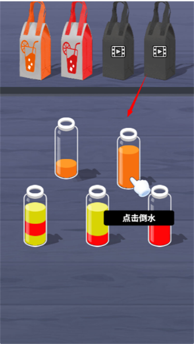 1、分类倒水:玩家需将不同颜色的水倒入相应试管或瓶子,确保颜色一致。