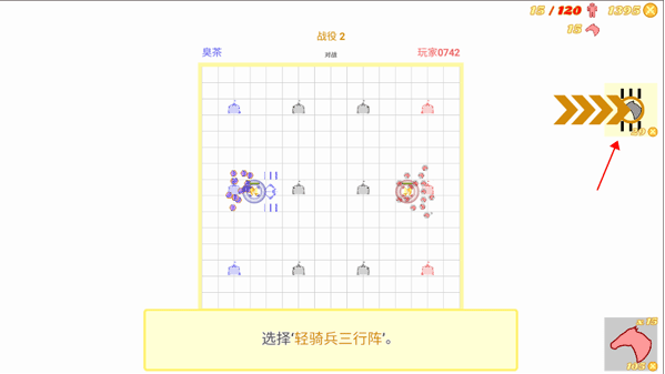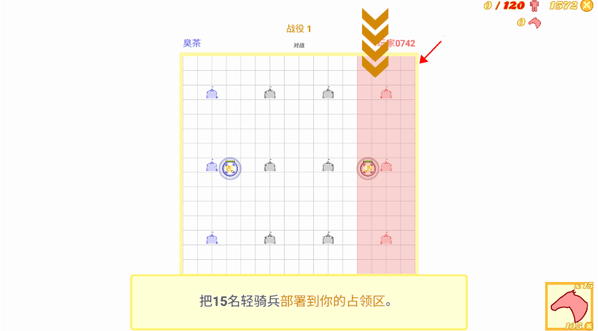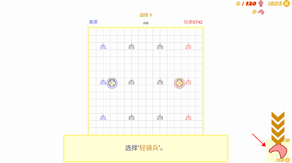 2、游戏的开始会有一个新手指导,先点击箭头指向的“轻骑兵”,将这些士兵排列在指挥官附近。