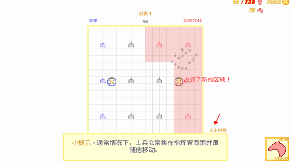 4、页面弹出一个小提示:通常情况下,士兵会聚集在指挥官周围并跟随他移动。