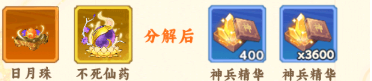 说明:可以分解出神兵精华,用于升级神兵等级。不同等级神兵分级出的神兵精华数量不同,神兵等级越高,分解后得到阵灵石越多