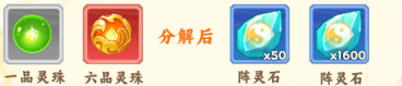 说明:灵珠可以分解出阵灵石,用于升级护山大阵等级,不同品级灵珠分解出阵灵石数量不同,品级越高,分解后得到阵灵石越多