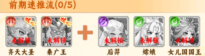 阵容说明:齐天大圣高攻击,自身带回复,放在前排抗伤害,后羿高伤害带点燃在后输出加速推关。秦广王可根据生命力追加伤害打妖王伤害高,自身还有无敌效果。嫦娥,女儿国国王,负责治疗,同时还能提供攻击,暴击。