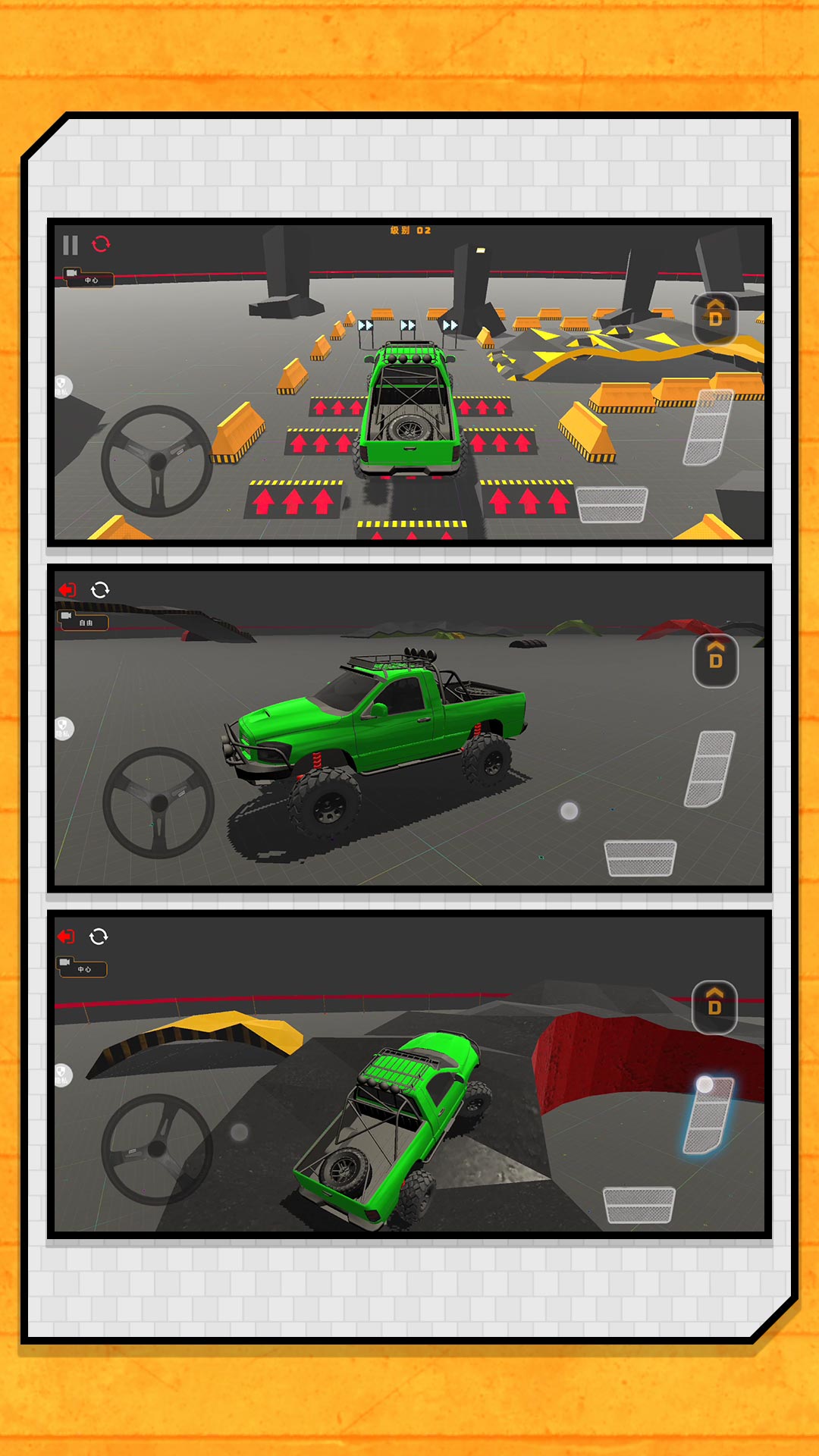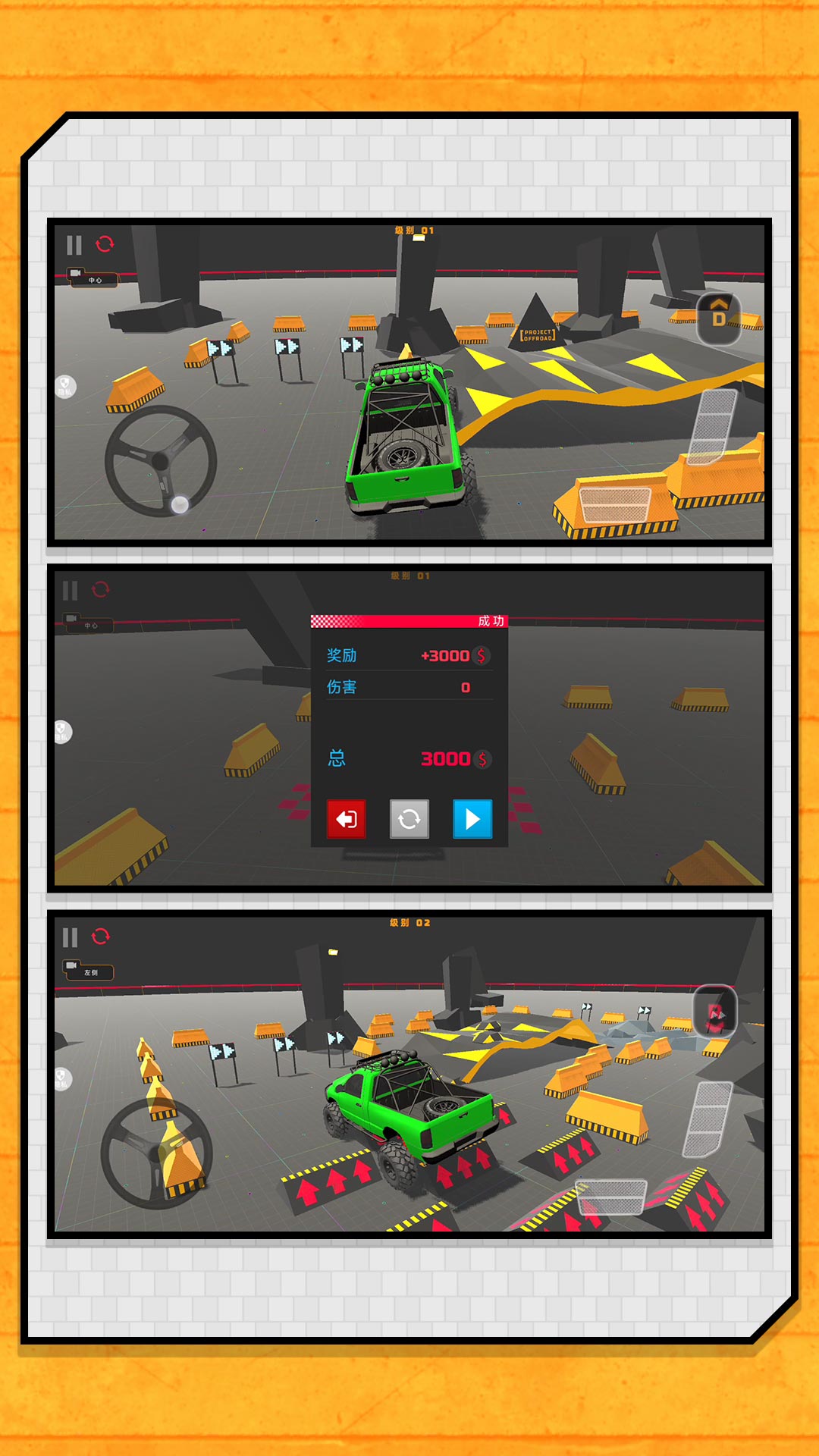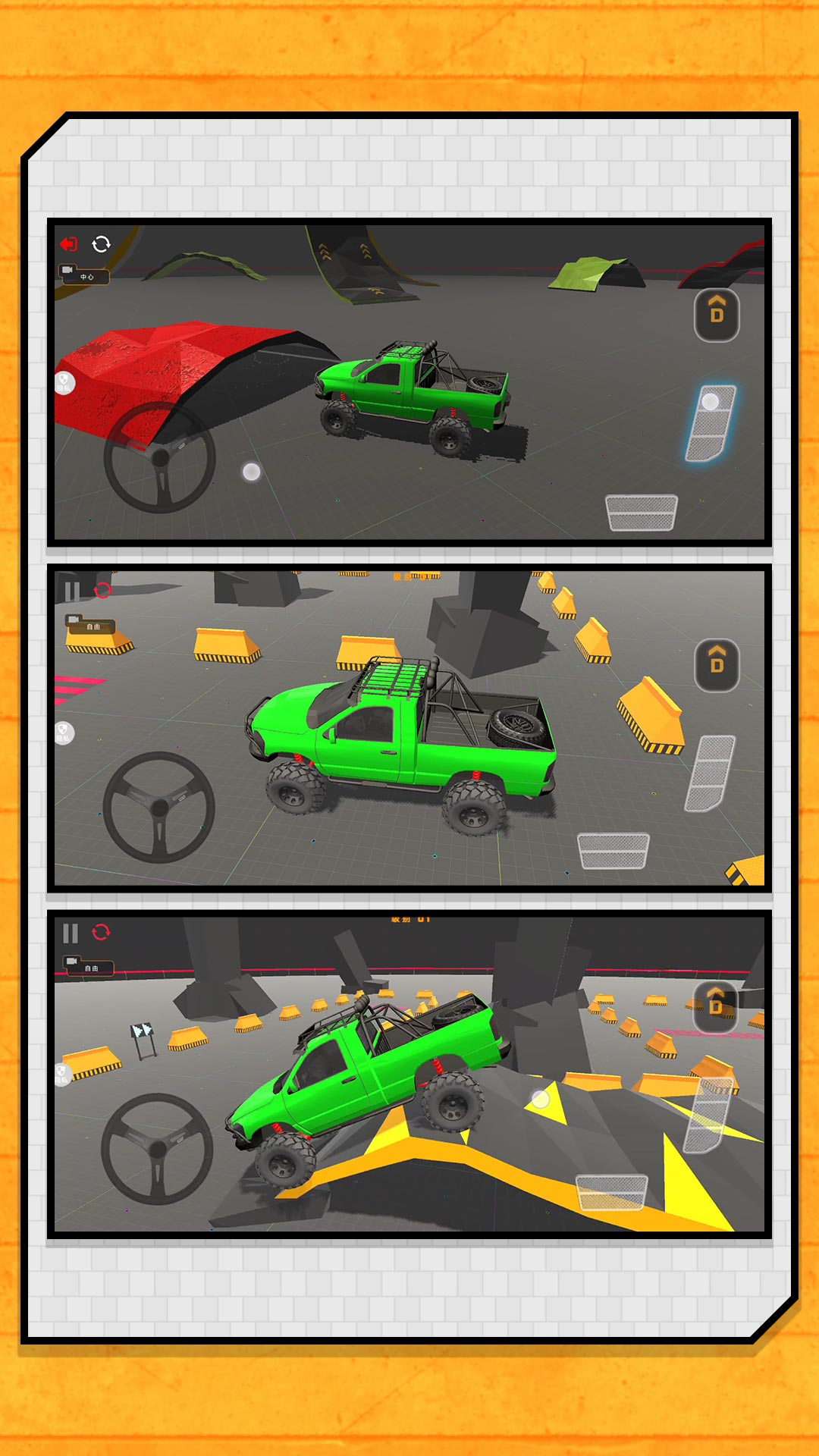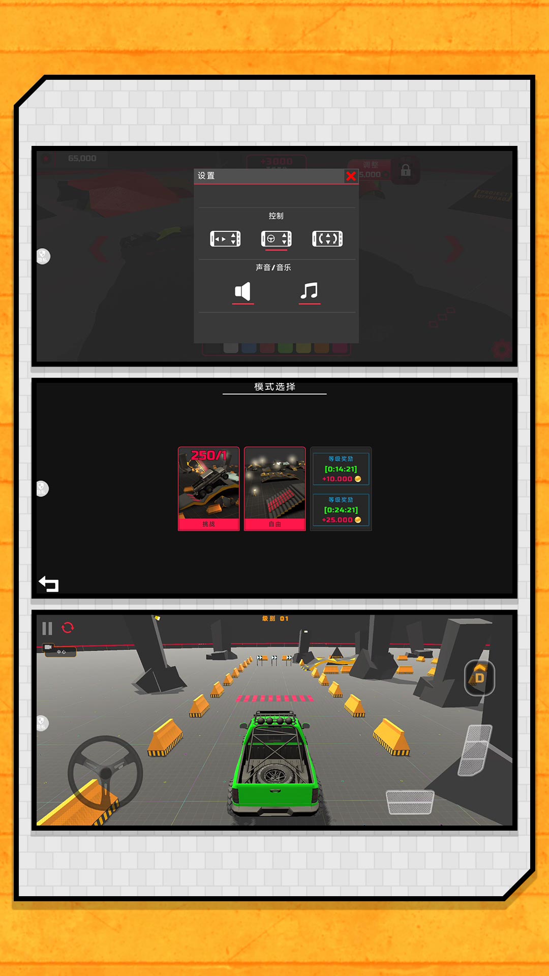 挑战模式:在复杂赛道上竞速,避开障碍,完成特技。