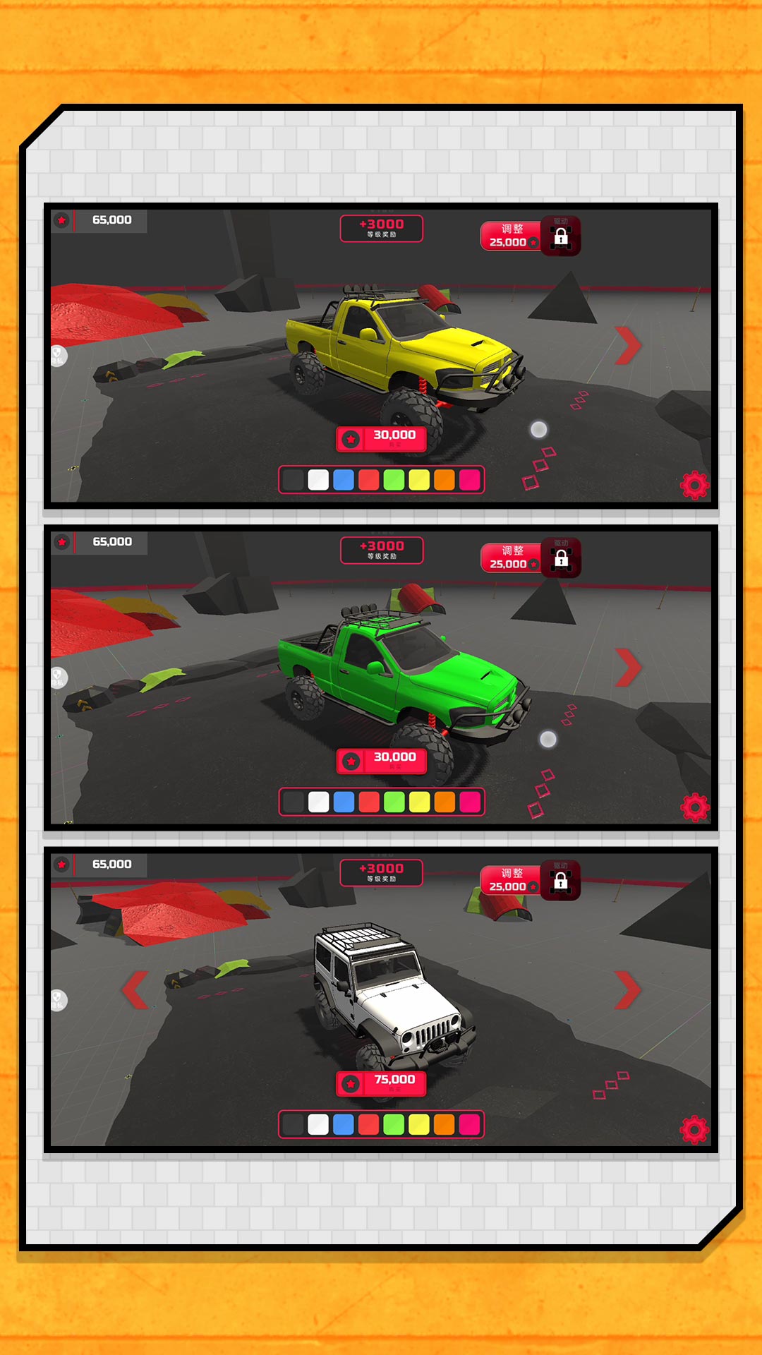 车辆解锁:用金币购买或升级部件,完成任务解锁新车。