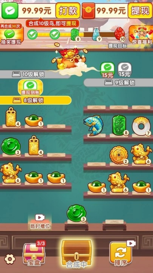 4、游戏以“三合一”合成为主要操作逻辑,玩家将相同珍宝合并生成更高级藏品,如铜币→银币→金币→宝石等,形成持续成长的正向反馈循环。