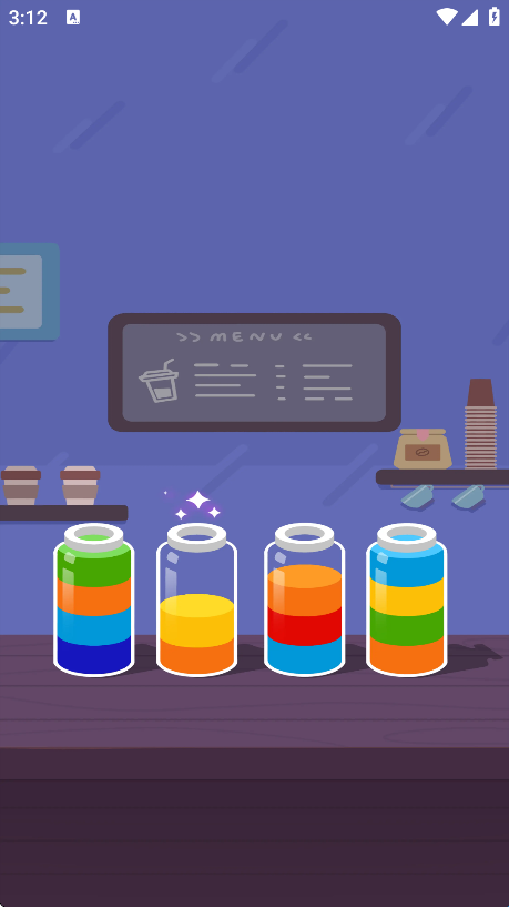 5、玩家需将装有不同颜色液体的瓶子通过倒水操作,使同色液体归入同一瓶中,当瓶子被单一颜色完全填满后自动“装袋”完成订单。