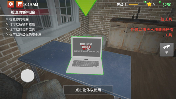 3、游戏中有些任务是有时间限制的,带有时间限制的任务可以在选择任务界面看到,开启此类任务,如果不能在规定的时间内完成所有的目标就会失败。所以尽量做好充足准备后再来,可以先开一次看看需要什么样的工具以及污渍的分布位置,然后放弃任务重新开始,重新开始污渍不会刷新位置,任务目标也不会改变。