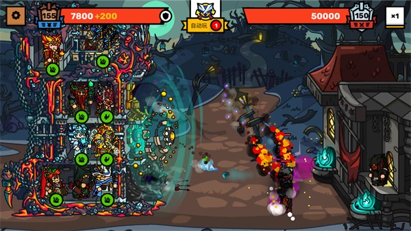 1、多维战斗体系:玩家可在塔楼中自由部署弓箭手、骑士、法师等兵种,并根据战局调整站位,如将弓箭手置于顶部远程输出,骑士置于底部冲锋陷阵。