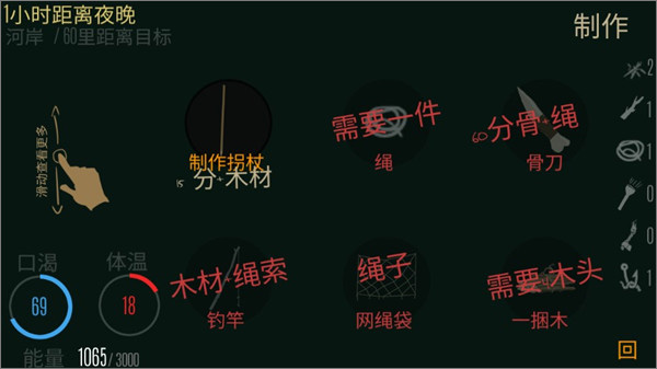 管理资源:分解物资(如木桨、能量棒)、制作工具(用刀与绳索制作陷阱)。