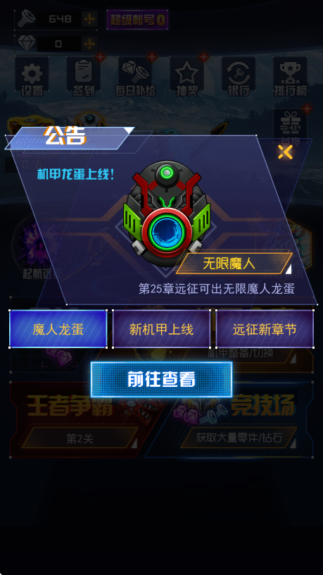 2、通过战斗获取机甲碎片、零件与神器,逐步解锁进阶部件与终极潜能,战力持续攀升。